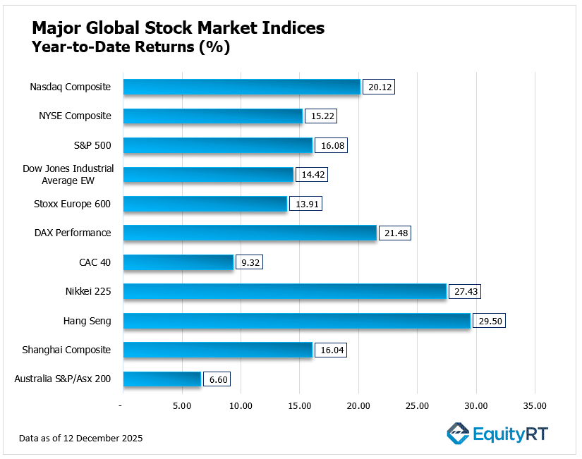 In the U.S., equity markets have also delivered strong returns. The Nasdaq Composite has gained 20.12%, supported by large-cap technology stocks, while the S&P 500 is up 16.08%. The Dow Jones Industrial Average (equal-weighted) stands at 14.42%, indicating that performance breadth has remained relatively healthy across sectors. The NYSE Composite’s 15.22% gain reinforces the broader strength across U.S. markets.