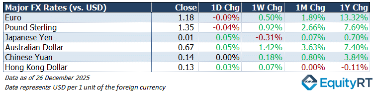 As of last Friday’s close, the broader macro backdrop continues to be shaped by a pronounced weakening in the U.S. dollar and a strong bid for precious metals. The U.S. Dollar Index (DXY) closed at 98.05, marking a 9.6% decline year to date, reinforcing dollar softness as a key cross-asset theme into year-end.