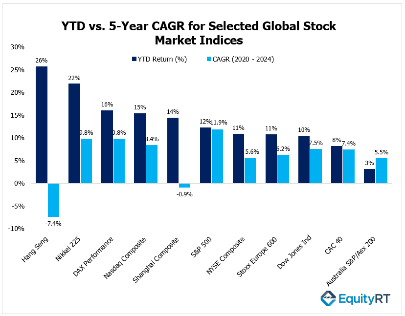 Asian markets have led year-to-date performance, with the Hang Seng advancing 29% and the Nikkei 225 rising 26%. However, longer-term returns paint a starkly different picture. The Hang Seng posted a 5-year CAGR of -7.4%, reflecting persistent structural headwinds in Chinese markets, while the Nikkei delivered a respectable 9.8% annualized growth over the same period. This contrast suggests that the Hang Seng’s recent strength reflects a cyclical rebound from depressed levels rather than sustained expansion, whereas the Nikkei’s gains are built on more solid foundations.